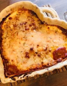 Après c’est la partie pas végane (mais végétarienne quand même) du tout. Une fois sortie du robot-cuiseur, on verse la « moussaka » dans un plat, on ajoute 3 cuillers de crème fraîche pour napper le tout et on saupoudre de parmesan avant de faire gratiner… (un jour j’essaierai avec des alternatives véganes, mais allons-y mollo quand même, je débute!)